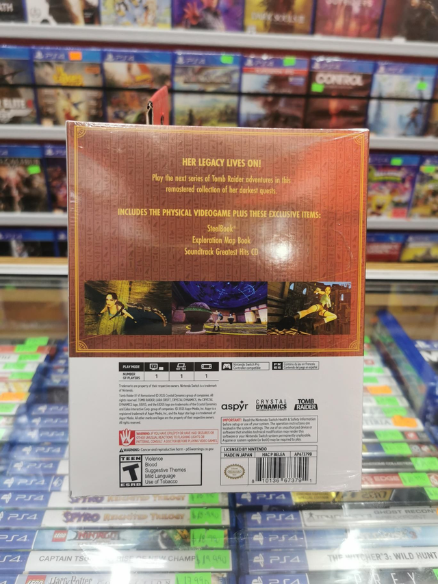 La Tomb Raider IV-VI Remastered Deluxe Edition para Nintendo Switch es una colección física que incluye los juegos clásicos remasterizados Tomb Raider: The Last Revelation, Chronicles y Angel of Darkness, junto con extras coleccionables como un steelbook, un libro de mapas con más de 150 páginas, y un CD con la banda sonora, todo en una caja de edición limitada. Ofrece gráficos clásicos y remasterizados, la opción de cambiar entre ellos, y permite jugar las aventuras más oscuras de Lara Croft.